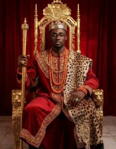 A hyper-realistic royal portrait of the person in the reference photo I sent earlier, seated on an ornate golden throne with intricate carvings and a red velvet backdrop. Keep the face exactly as in the provided reference image without altering identity or facial features. The subject wears a richly detailed red traditional royal robe, coral bead necklaces, and bracelets, with a leopard skin draped over one shoulder. A golden crown rests on the head and a tall golden staff is held firmly in one hand. The setting is majestic, with luxurious textures, glowing golden details, and dramatic studio lighting that emphasizes authority, dignity, and power. Ultra-detailed, cinematic, high-resolution style.