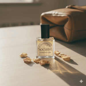 "A warm lifestyle product photo featuring the perfume on a wooden tabletop, natural late-afternoon sunlight streaming from the left, soft shadows, casually scattered dried petals and a leather travel bag in the background. Bottle slightly angled to show the label. Filmic color grading, shallow depth of field for a cozy, approachable luxury look. Ultra-realistic, 50mm lens, f/1.8, high resolution, clean product focus, perfect for social media hero images."