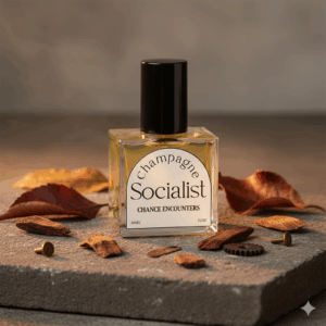 "A luxury studio shot of a perfume bottle. Front and center, glass bottle with a matte black cap, placed on a textured stone surface. Surrounding props: scattered dry leaves, small wooden chips, and subtle metal accessories to add masculine, rustic charm. Shallow depth of field, dramatic cinematic side lighting (warm golden rim light + soft fill), strong highlights on glass and liquid, clean readable label, soft bokeh background with subtle studio haze. Ultra-realistic, photoreal, shot on DSLR, 85mm lens, f/2.8, 1/200s, ISO 100, 8k detail, studio product photography style, professional retouching, high dynamic range."